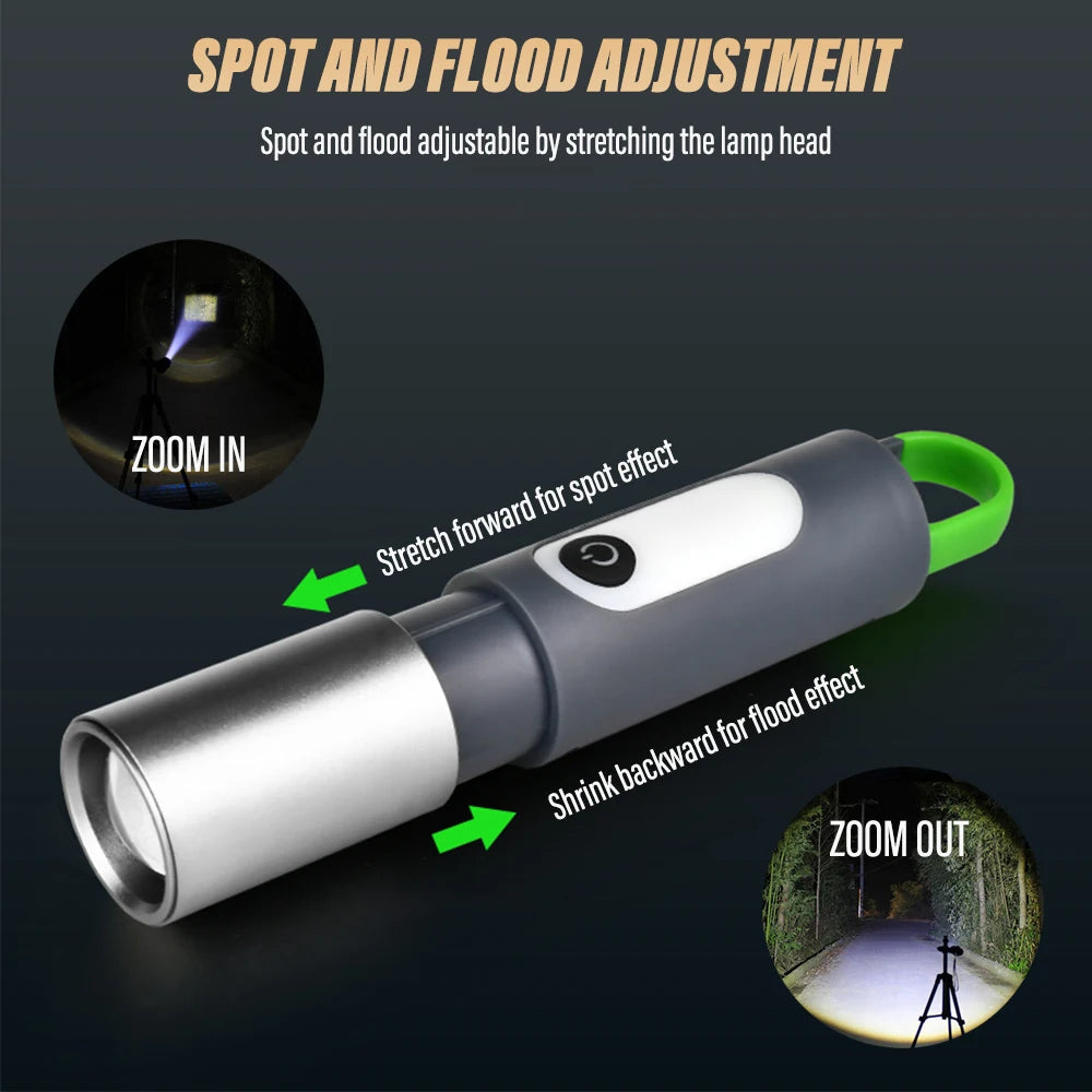 Teleskopischer Zoom: Einfach das Lampenkopf ziehen, um zwischen Fern- und Nahbeleuchtung zu wechseln. Perfekt für präzise oder weite Lichtstrahlen.
