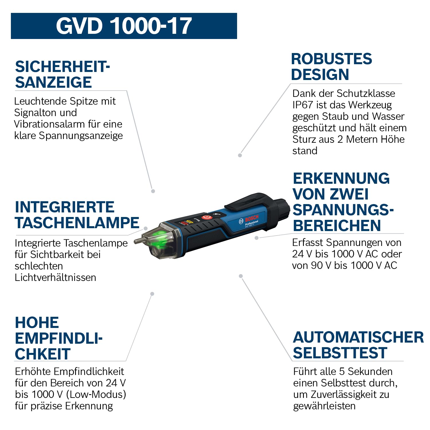 The Bosch GVD 1000-17 is a professional, contactless voltage tester For reliable detection of alternating voltage in the low-voltage and high-voltage ranges. Ideal for use on construction sites – compact, waterproof, and extremely reliable.