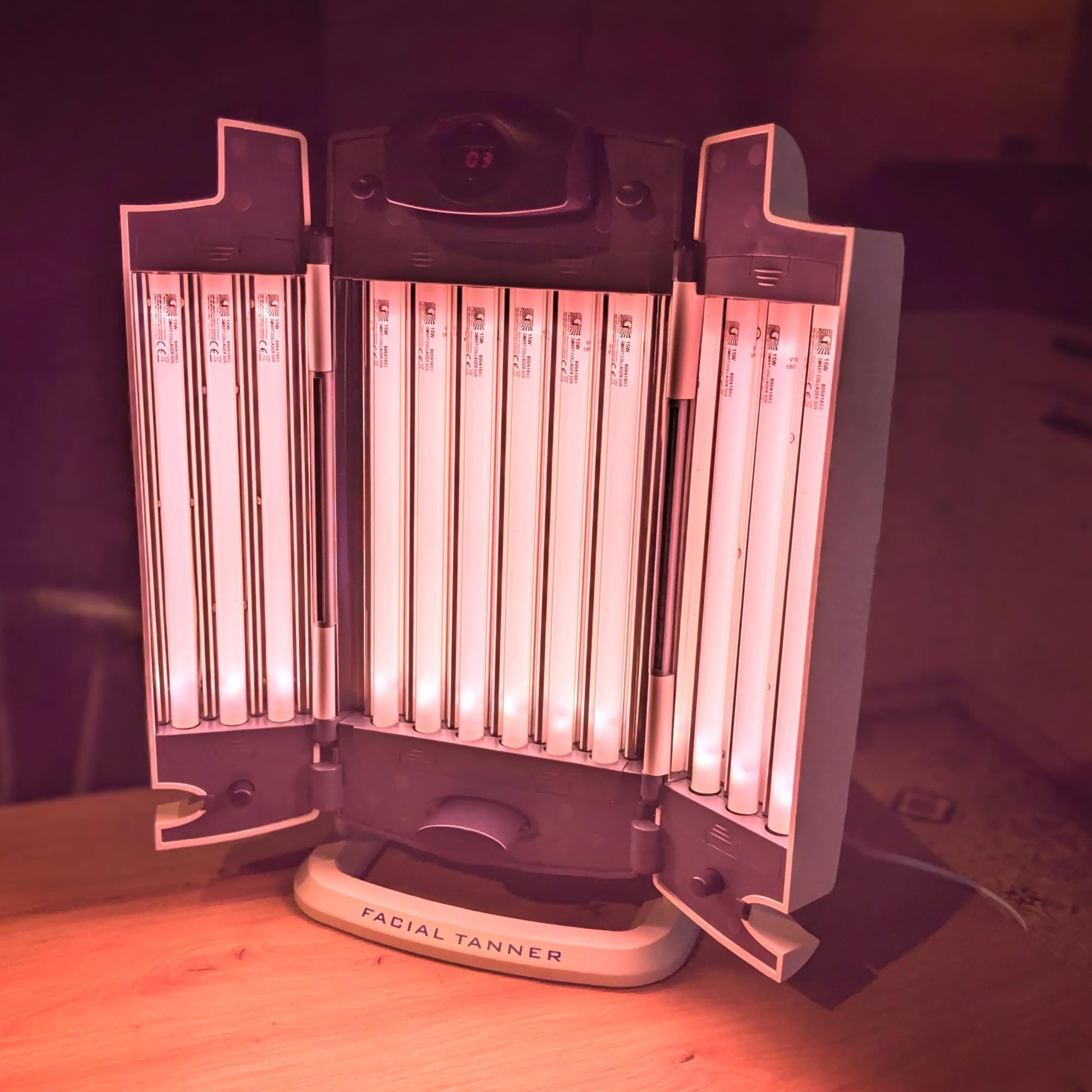 Hinged design with double doors and spring buttons - ideal for targeted facial tanning