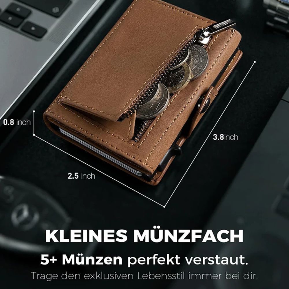 Slim, elegant design: With the innovative pop-up mechanism, the wallet is particularly compact (9.6 x 6.5 x 2cm) and fits effortlessly into any pocket.