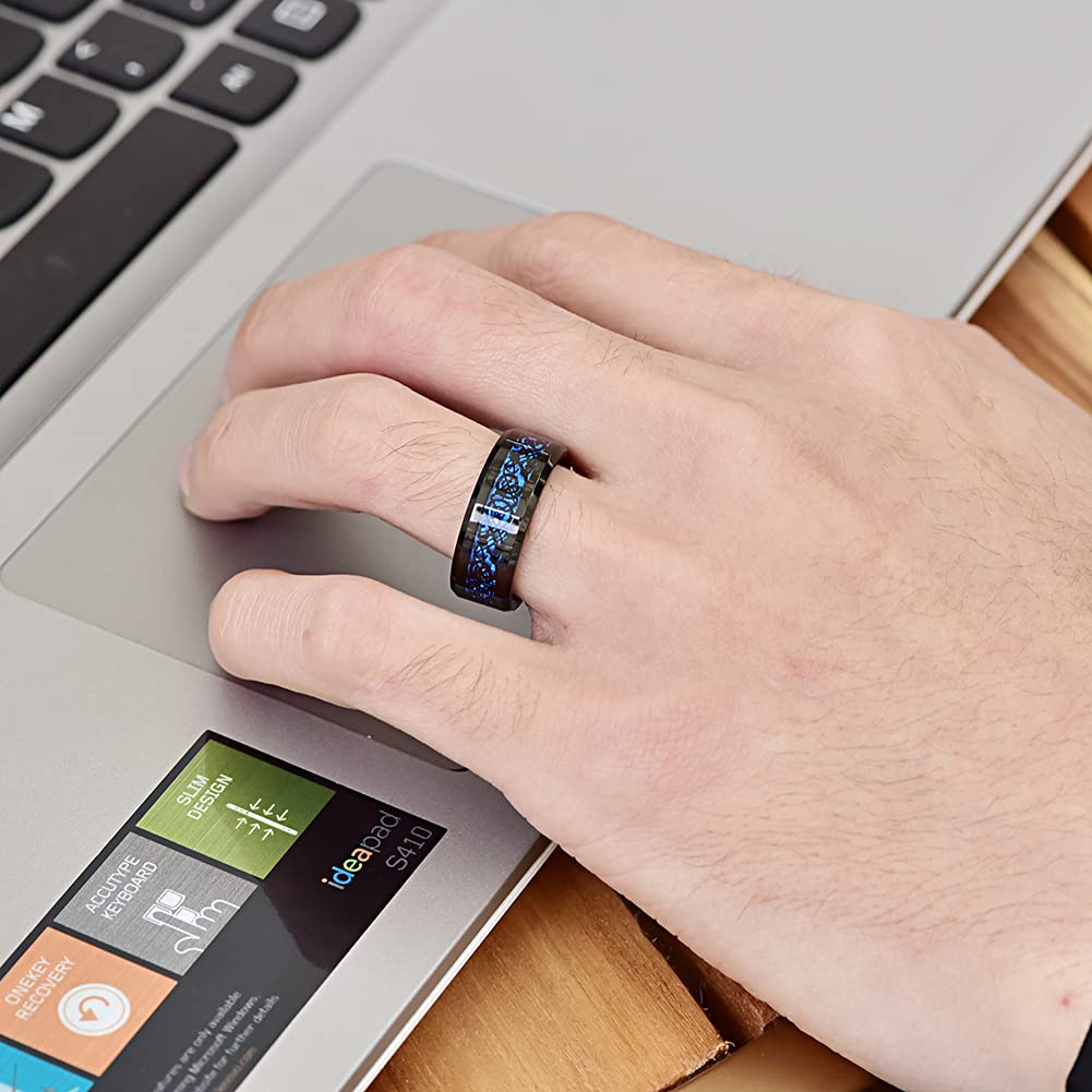 Design: Black tungsten ring with Celtic dragon pattern and blue carbon fiber inlay - eye-catching and symbolic