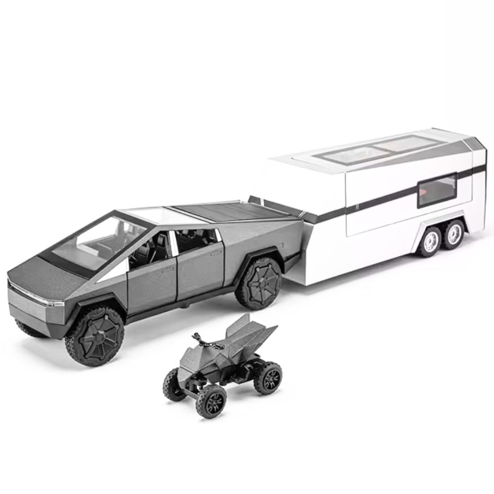 TESLA Cybertruck Model Car (1:32) with Trailer and Beach Motorcycle | Made of Die-Cast Metal with Light and Sound
