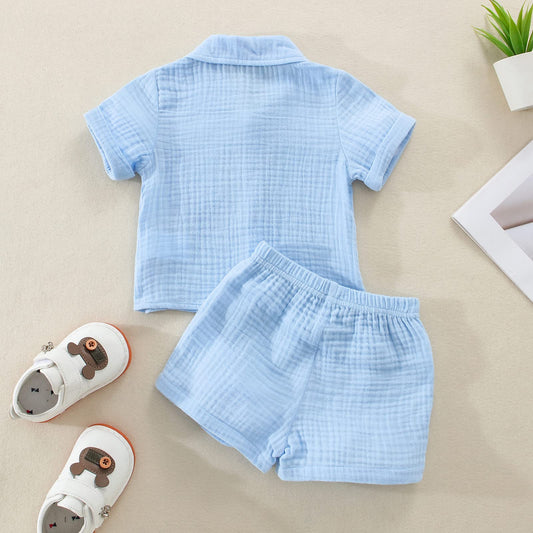 Zweiteiler-Kleidung-Set für Kleinkind, Jungen: Baumwolle-Leinen Outfit (Blau - in verschiedenen Größen)
