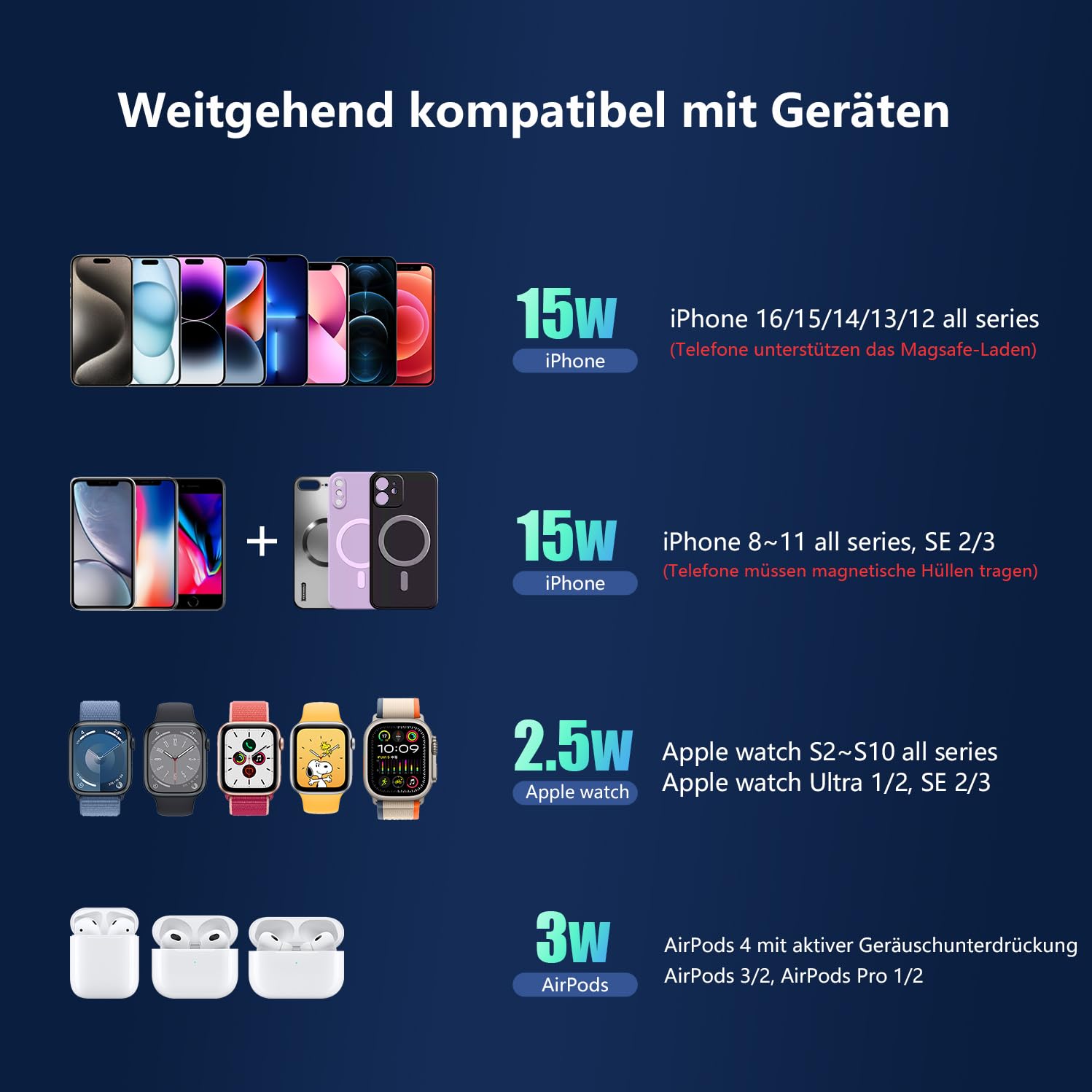 Kompatibel mit iPhone 8-16 Serien, Apple Watch Series 2–Ultra 2 und allen gängigen AirPods-Modellen.
