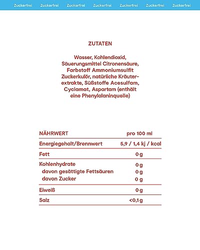 Zutaten: Wasser, Kohlensäure, Säuerungsmittel Citronensäure, Farbstoff Ammonsulfit-Zuckerkulör, natürliche Kräuter-Extrakte, Süßstoffe Acesulfam, Cyclamat, Aspartam (enthält eine Phenylalaninquelle).