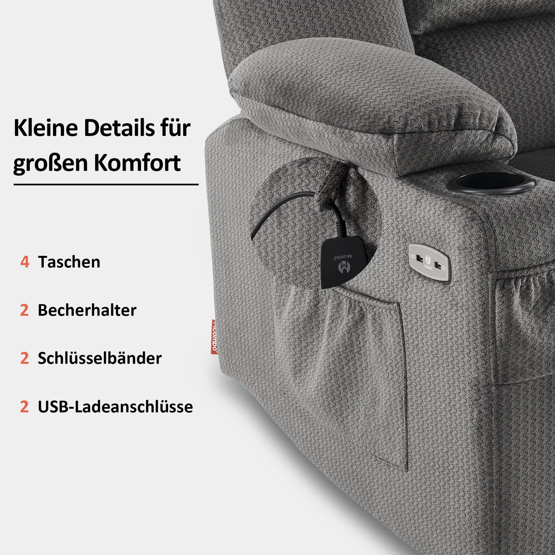 M MCombo Fernseh- Relaxsessel (7008) mit Liege-, Massage und Wärmefunktion: Elektrisch verstellbar, USB & Getränkehalter in Grau