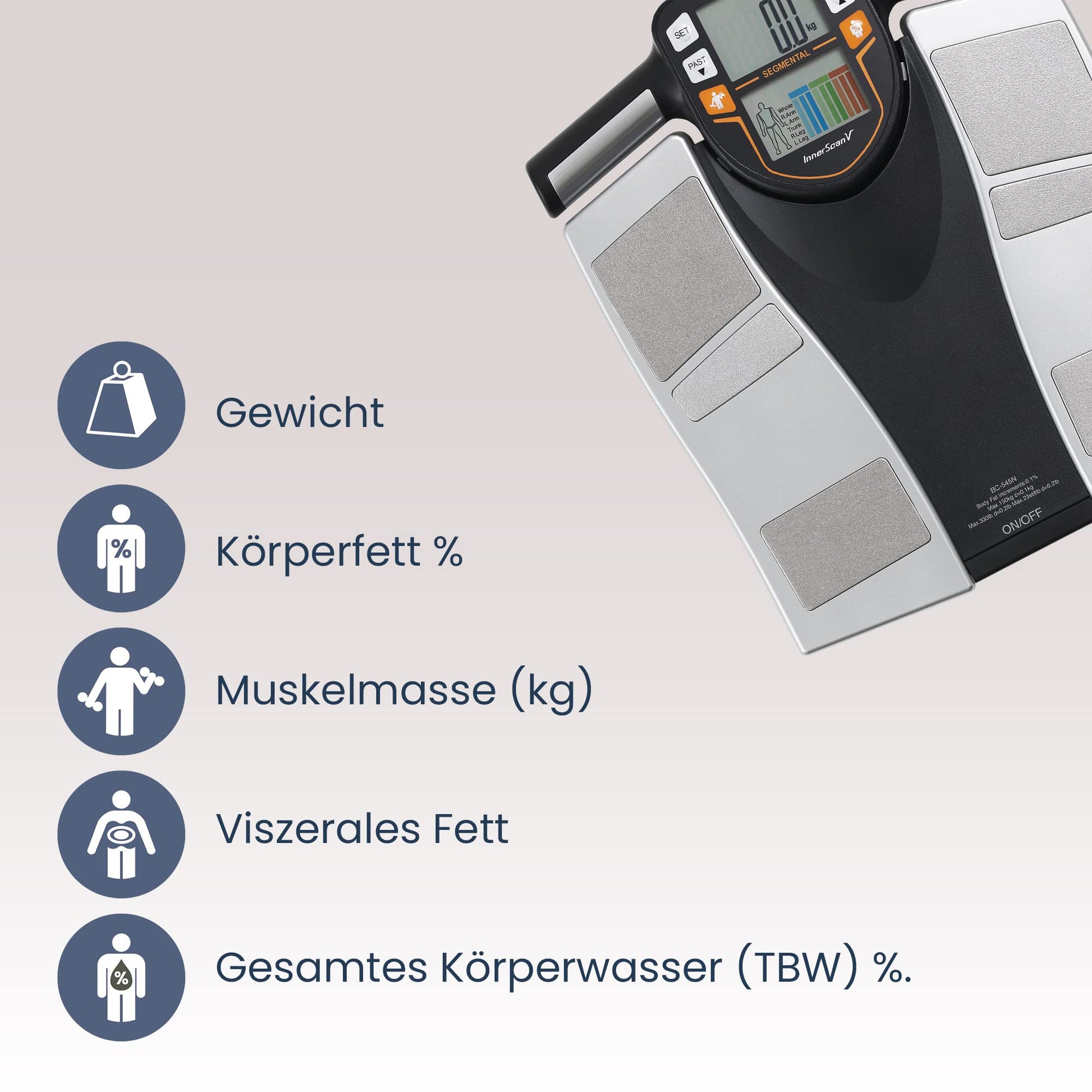10 präzise Körpermesswerte in nur 15 Sekunden - inklusive Körperfett, Muskelmasse, Viszeralfett, Körperwasser, BMI und Grundumsatz