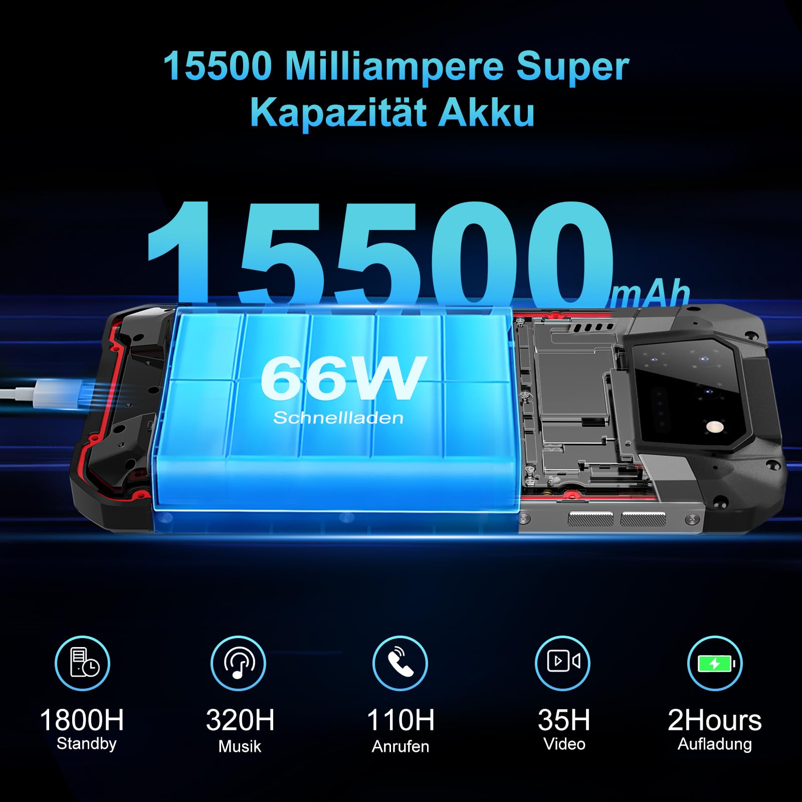 - Extrem leistungsstarker Akku: 15500 mAh Kapazität, 66W Schnellladen (voll in ca. 2 Stunden) und OTG-Unterstützung als Powerbank-Ersatz.