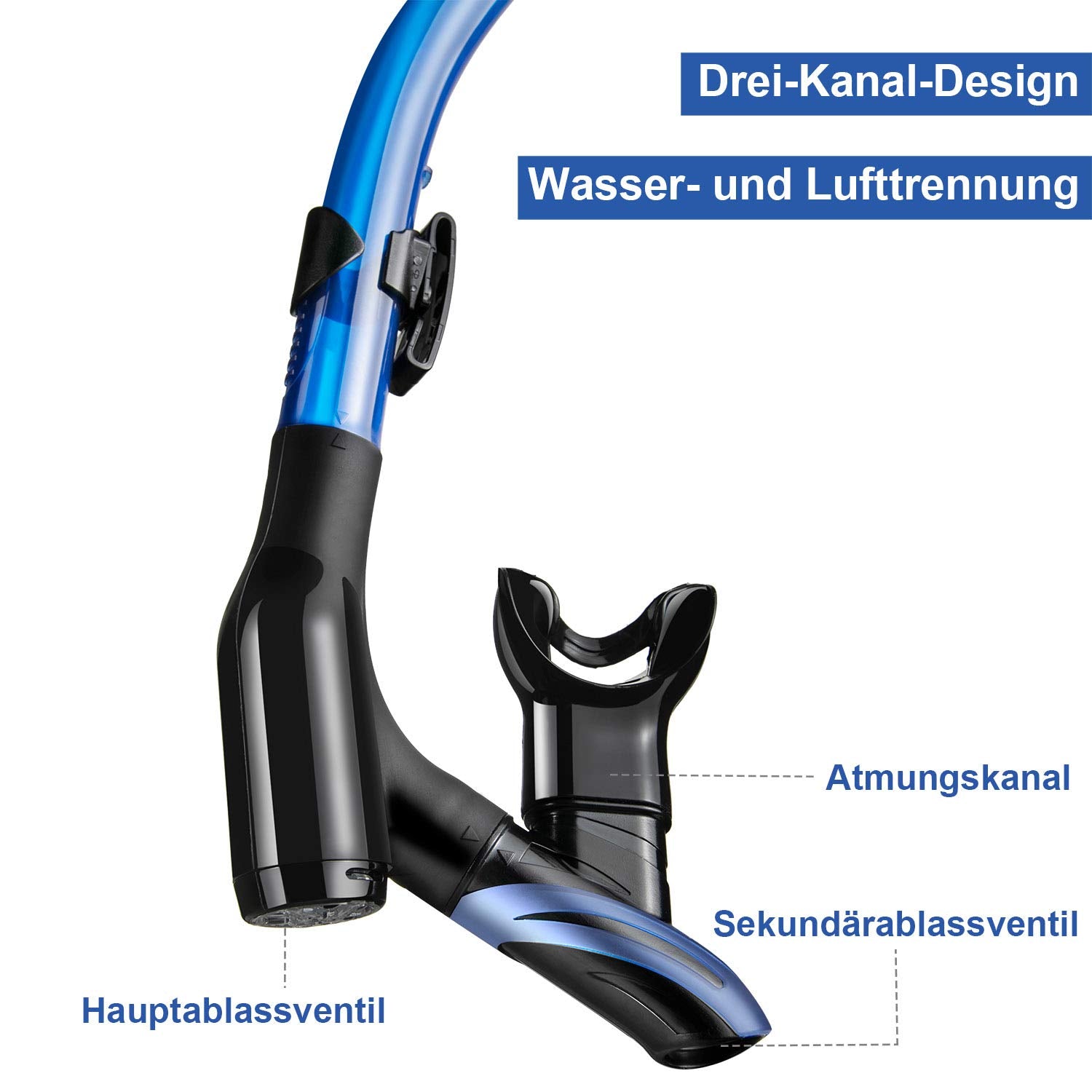 Trocken-Schnorchel mit 3-Kanal-System: Haupt-/Hilfsventile & Luftkanal - schützt effektiv vor Wasser