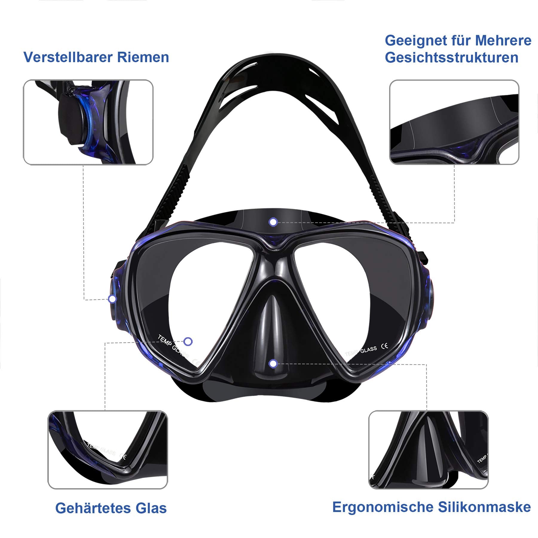 Set mit Schnorchel und Taucherbrille: Anti-Fog 3-Kanal Tauchmaske aus gehärtetem Glas