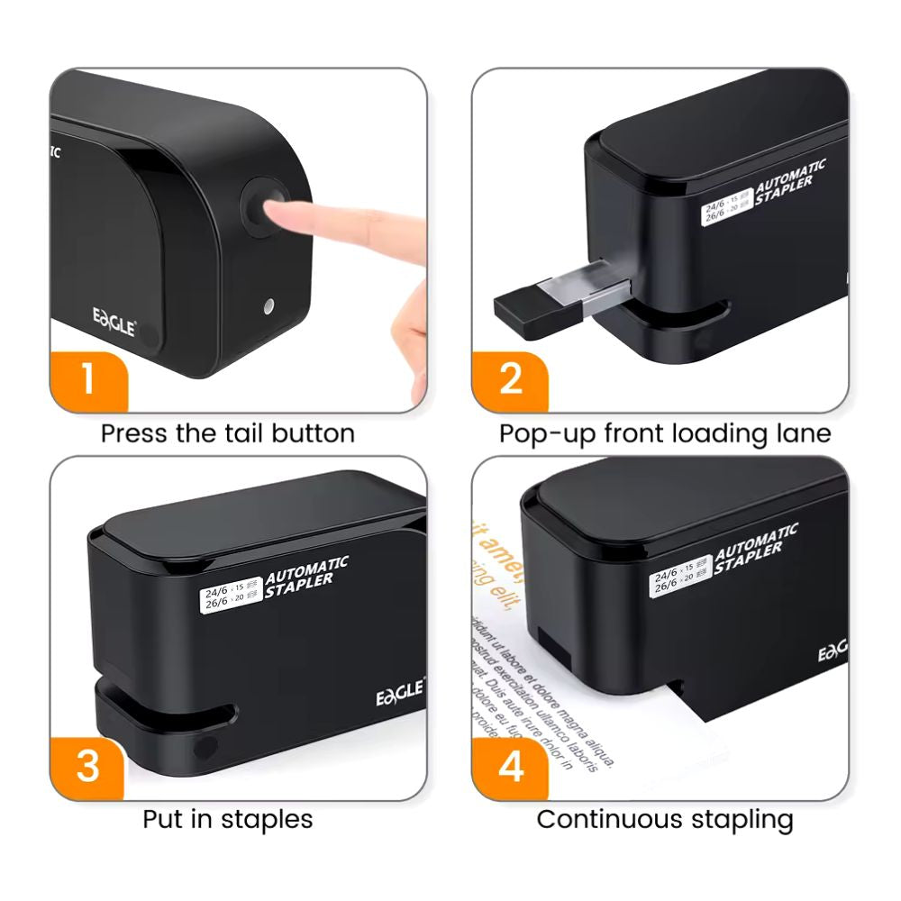Avec l' agrafeuse électrique EAGLE, vous pouvez réaliser vos tâches de bureau et d'école sans effort ! Grâce à son moteur puissant et à sa fonction d'agrafage automatique, c'est le choix parfait pour un agrafage rapide et précis.