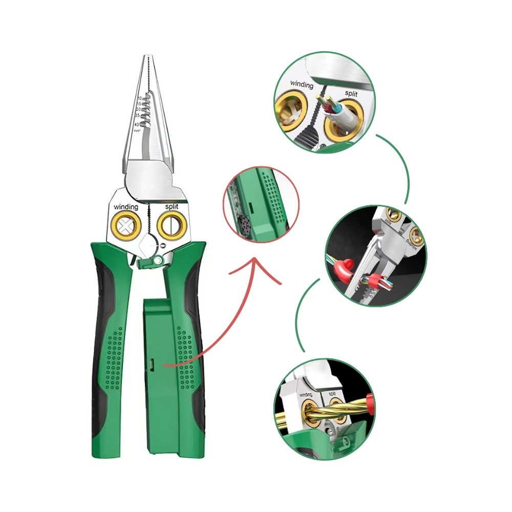 Cet outil multifonction 8 en 1 regroupe toutes les fonctions importantes dont les électriciens ont besoin : couper, dénuder, fendre les câbles, enrouler, ouvrir, tirer et bien plus encore...
