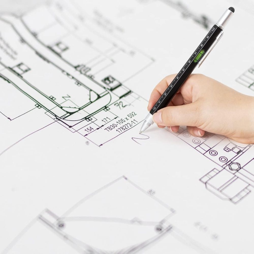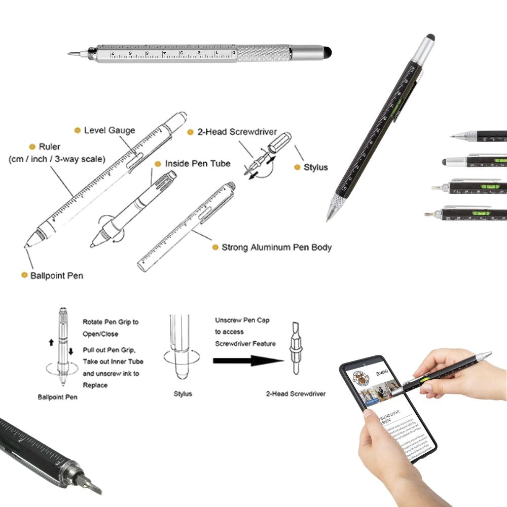 Doté d'un stylet tactile , d'un tournevis (Phillips) , d'un tournevis + outil de précision (plat) , d'un niveau à bulle et d'une règle, il combine six fonctions pratiques dans un design compact.