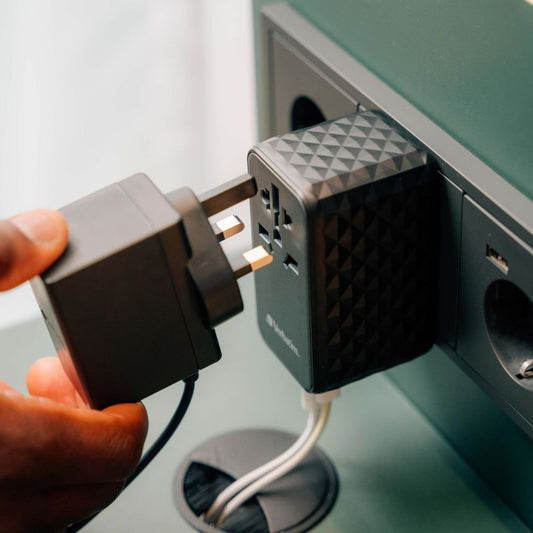 • Verbatim UTA‑06 - Universeller 5-in-1 Reiseadapter mit GaN-Technologie & Schnellladefunktion