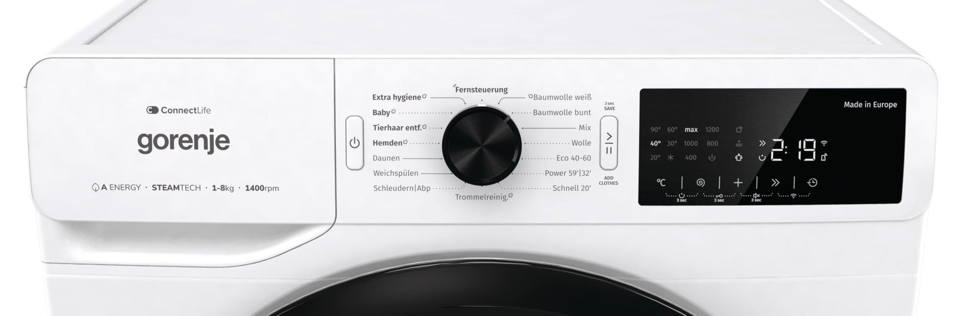- 19 Programme, u. a. Baumwolle, PowerWash 59', ExtraHygiene, Tierhaarentfernung