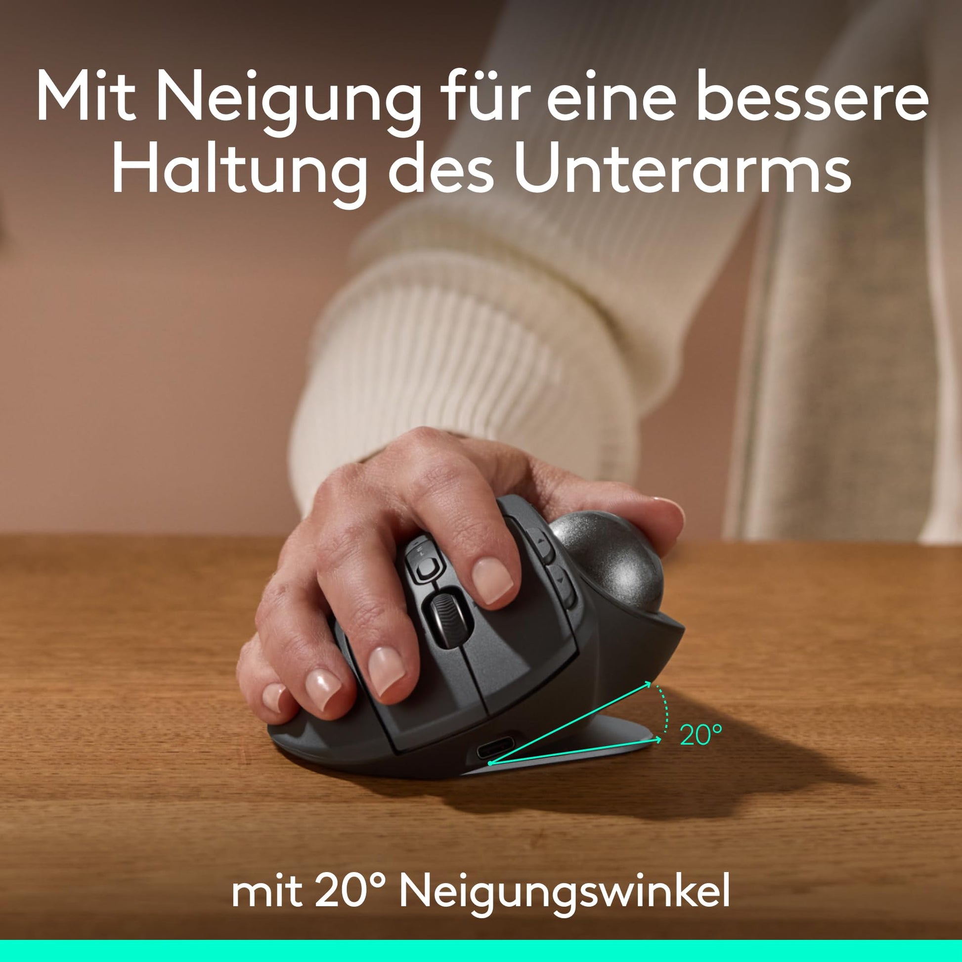 Die MX Ergo S ist die fortschrittlichste ergonomische Trackball-Maus von Logitech, mit einem Neigungswinkel von 20 Grad und präziser Daumensteuerung - von Ergonomen getestet und zertifiziert. Die kabellose ergonomische Maus MX Ergo S ist so geformt, dass sie in die Handfläche passt und eine entspannte Bedienung ermöglicht. Sie neigt sich um 20 Grad, was zu 27 % weniger Muskelaktivität im Unterarm führt (1) und den gesamten Tag über erhöhten Komfort bietet. Arbeiten Sie schneller mit 6 anpassbaren Tasten und einer DPI-Taste, um mühelos zwischen Geschwindigkeit und hochpräzisem Tracking zu wechseln. Jetzt mit 80 % leiseren Klicks (5). Für noch mehr Kontrolle, die auf Ihre Bedürfnisse zugeschnitten ist, weisen Sie zeitsparende Verknüpfungen und Smart Actions mit der Logi Options+ App (2) zu. Verbinden Sie Ihre kabellose Maus über Bluetooth oder den mitgelieferten Logi Bolt-Empfänger mit 2 Geräten und wechseln Sie mit einem Klick auf die Easy-Switch-Taste zwischen den Geräten. Laden Sie die wiederaufladbare Maus mit einem USB-Kabel Typ C zu Typ C oder Typ A zu Typ C (nicht im Lieferumfang enthalten) auf und profitieren Sie von 24 Stunden Nutzung mit einer 1-minütigen Aufladung. Eine vollständige Ladung hält bis zu 120 Tage (3). (1) Am Unterarm mit 20-Grad-Winkel, verglichen mit einer Logitech M650 Maus. (2) Erfordert die Logi Options+ App, verfügbar für aktuelle Versionen von Windows und macOS (3) Die Akkulaufzeit ist abhängig von Nutzungs- und Umgebungsbedingungen. (4) Ausgenommen Kunststoff bei Empfänger, Leiterplattenbaugruppe (PWA) sowie Verpackung. (5) Vergleich des Schallpegels zwischen MX Ergo S und MX Ergo. Linksklick-dBA, gemessen vom internen Logitech-Labor in 1 m Entfernung. (6) Für andere Betriebssysteme als Windows und macOS werden die grundlegenden Gerätefunktionen ohne zusätzliche Treiber unterstützt.